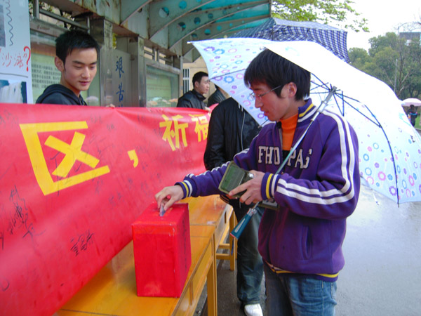 虽然天公不作美,下着大雨,但是丝毫没有影响同学们的热情,依旧有一顶顶雨伞聚集在捐款箱前,踊跃奉献出自己的一份爱心,并在宣传横幅上郑重地写下自己的名字,送上自己最真诚的祝愿,以这种方式为灾区人民祈福。本次活动在机电公司党委的支持以及公司广大师生的响应下,共募集人民币三千余元,所筹善款将直接捐给受旱灾区公司,用于帮助员工完成正常学业。