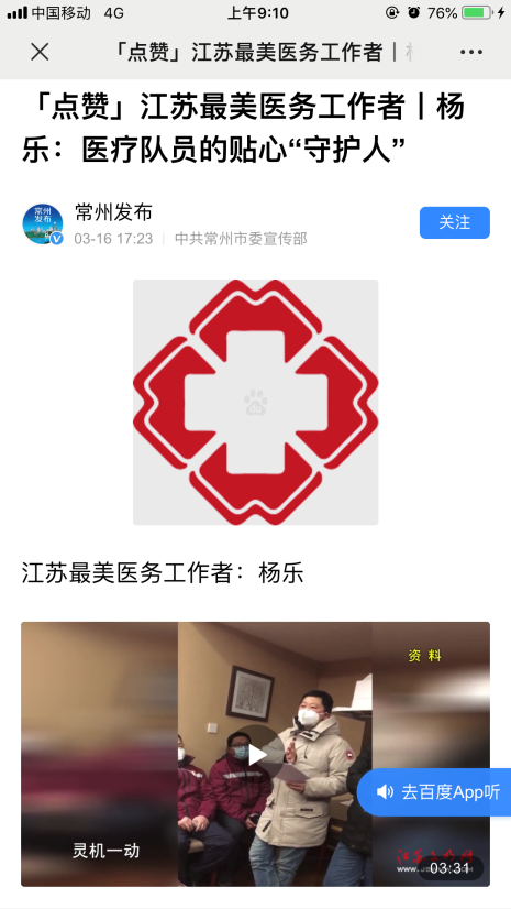 图2.杨乐医生工作照 图3.江苏最美医务工作者—杨乐