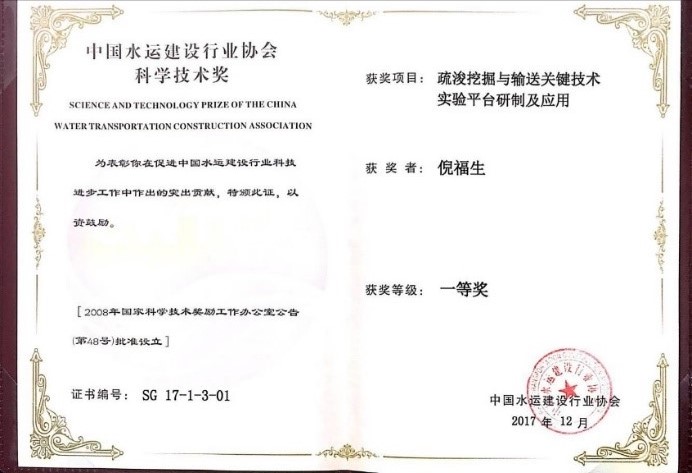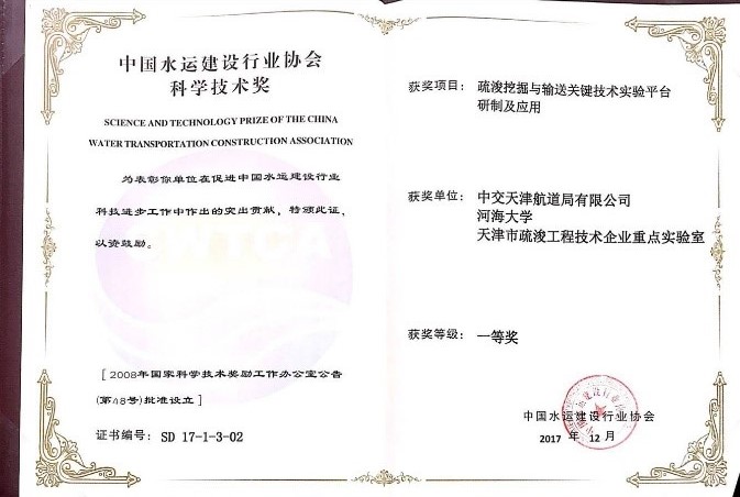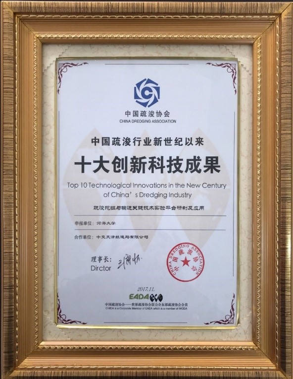 中国水运建设行业协会组织鉴定,该成果总体上达到了国际先进水平,其中,疏浚输送实验平台达到了国际领先水平。成果荣获“2017年度中国水运建设行业协会科学技术一等奖”,并入选中国疏浚行业首次评选的“新世纪以来十大创新科技成果”,也是行业内唯一入选的来自高校的成果。
