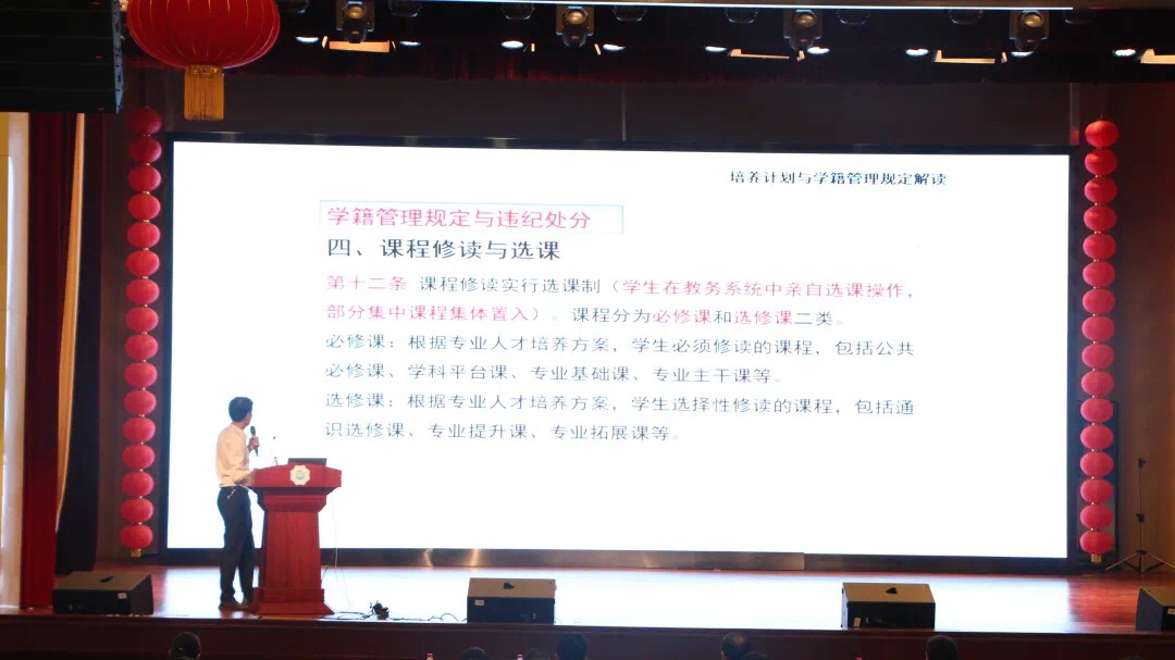 副经理苑明海向新生们详细介绍了本科生培养计划与学籍管理规定,强调了请假事项、选课制度与选课程序、课程考核与成绩记载等重要事项,并介绍了关于转专业、转学、休学、双学位、毕业等相关事项。苑经理尤其强调河海学子应该严格遵守考试纪律,考试纪律红线不能跨过半步!