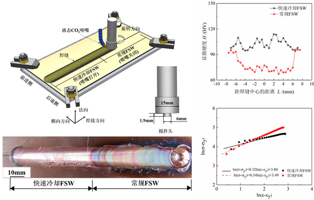 焊接是纯铜复杂结构件制造过程中不可或缺的加工工艺。目前,工业上主要采用熔化焊的方法来连接纯铜。但由于纯铜较高的熔点和良好的导热性,采用熔化焊方法对其焊接时往往需要较大的热输入,因此焊缝易出现晶粒粗大、气孔和裂纹等缺陷。这些缺陷可严重恶化焊缝的力学性能并降低纯铜结构件的服役可靠性和寿命。本团队采用液态二氧化碳同步快速冷却搅拌摩擦焊工艺对T2纯铜薄板进行焊接,利用“宏观-介观-微观”多尺度结构表征手段和力学性能测试方法对焊缝的微观组织和加工硬化行为进行了深入研究。通过改善焊接热循环可在纯铜焊缝中制备异质细晶结构,有助于提高焊缝的屈服强度并使其表现出良好的强塑性匹配。本研究为具有面心立方结构的中低层错能金属或合金(如奥氏体不锈钢、殷瓦钢、镍基合金等)焊缝的综合力学性能改善方面提供了新的思路。