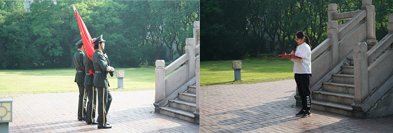升旗仪式开始,伴随着雄壮的《义勇军进行曲》,鲜艳的五星红旗冉冉升起。国旗下,全场人员庄严肃立,仰视国旗行注目礼,齐声高唱国歌。