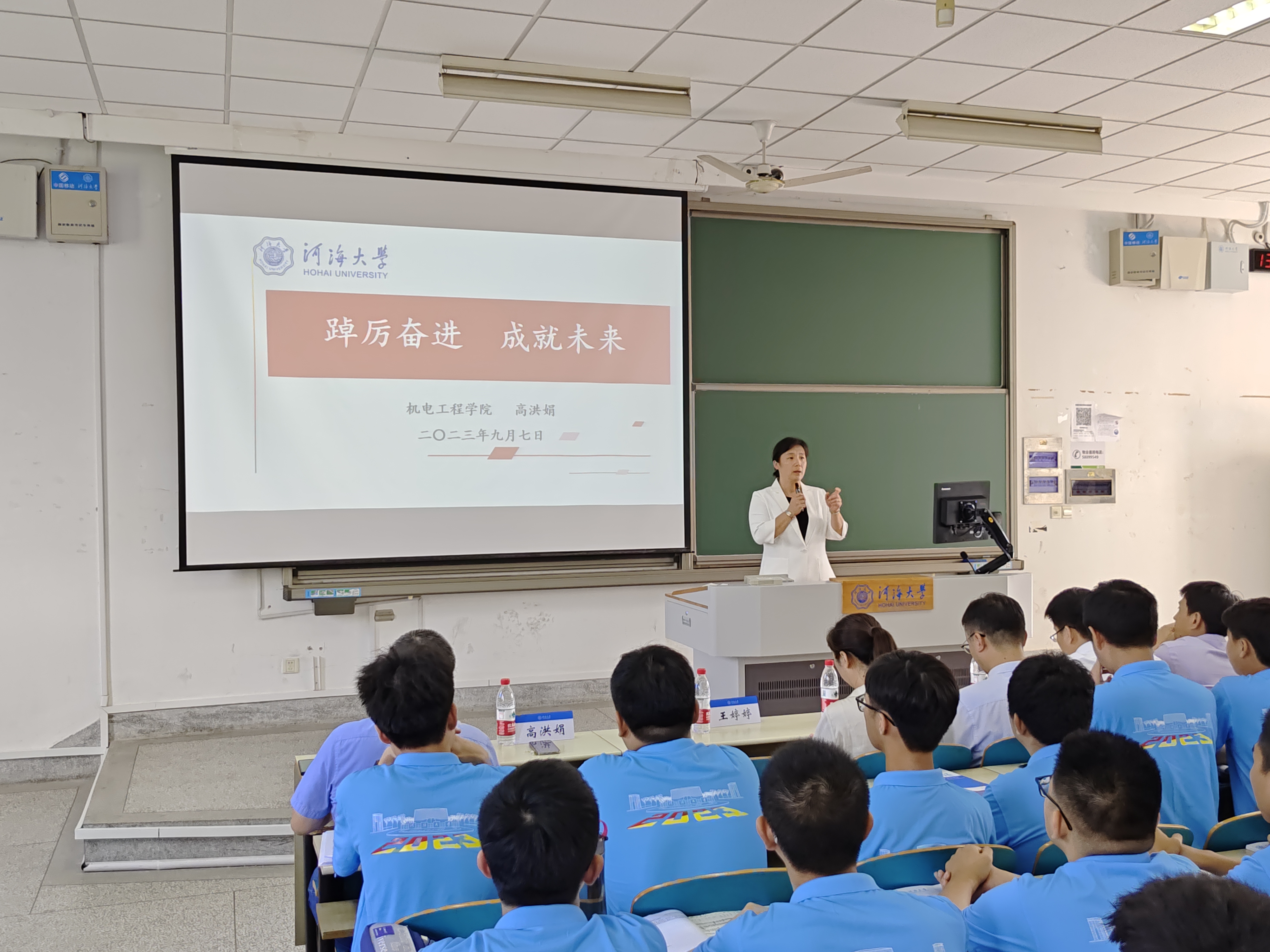 在集体奏唱国歌之后,公司党委书记高洪娟老师为大家讲授了“开学第一课”。高书记以“河孕育文明,海凝聚智慧”为引导,从“百年河海”、“红色基因”、“成就未来”三大方面让同学们全方位、多层次地了解了作为“河海人”的意义与担当,并由此对同学们提出了三点希望:自立自强,志存高远;踔厉奋进,知行合一;笃行不怠,成就未来。