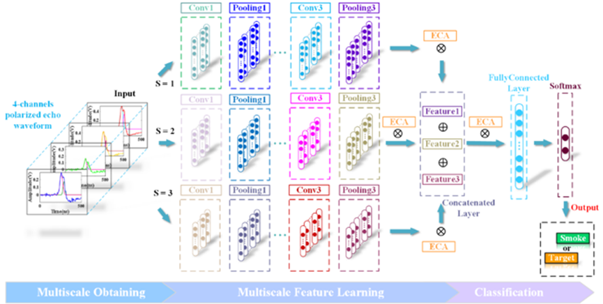 脉冲激光有着发射波束窄、峰值功率大、方向性好等优点,在无人驾驶、遥感、机器人同时定位与建图等领域表现出优良的探测性能。但是,脉冲激光探测常会受到环境中的云雾、降雨和烟雾等粒子干扰,产生严重的后向散射形成干扰回波信号,影响激光探测性能。课题组针对脉冲激光在烟雾环境下的抗干扰问题进行深入研究,利用小波去噪方法、拐点法和智能优化算法实现全波形分解,提取单个回波波形。利用目标偏振特性,结合分解后的四路偏振回波信号,构建基于ECA注意力机制融合的多尺度卷积神经网络,精确区分烟雾和目标。研究不同卷积核数量下的识别精度,获得最优模型参数。当烟雾浓度在709.69mg/m3~1094.63mg/m3,目标识别准确率超过99%。该成果为研究激光探测在复杂环境下的抗干扰问题提供了新思路,为研究无人驾驶全天候探测提供理论基础,为研究提升遥感探测能力提供有效方法,同时也为研究恶劣环境下机器人野外救援提供技术支撑。