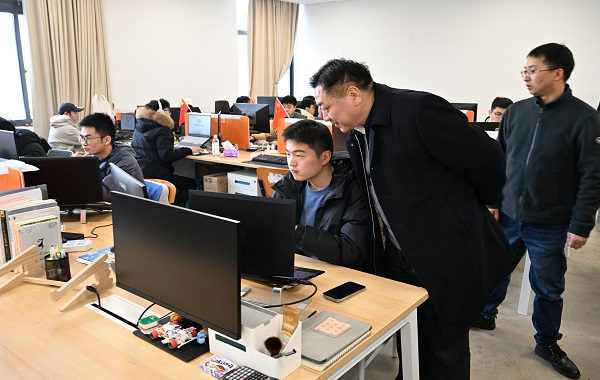 陆书记首先来到教学楼与同学们一起聆听新学期第一课。同学们精神饱满,全神贯注的投入新学期的课程学习中,展现出良好的精神面貌。在听课间隙,他与师生进行了深入交流,了解教师授课、员工学习等方面情况,并向师生们表达了新学期的良好祝愿。随后,陆书记深入公司走访,参观了公司本科教学实验室、研究生工作室等。