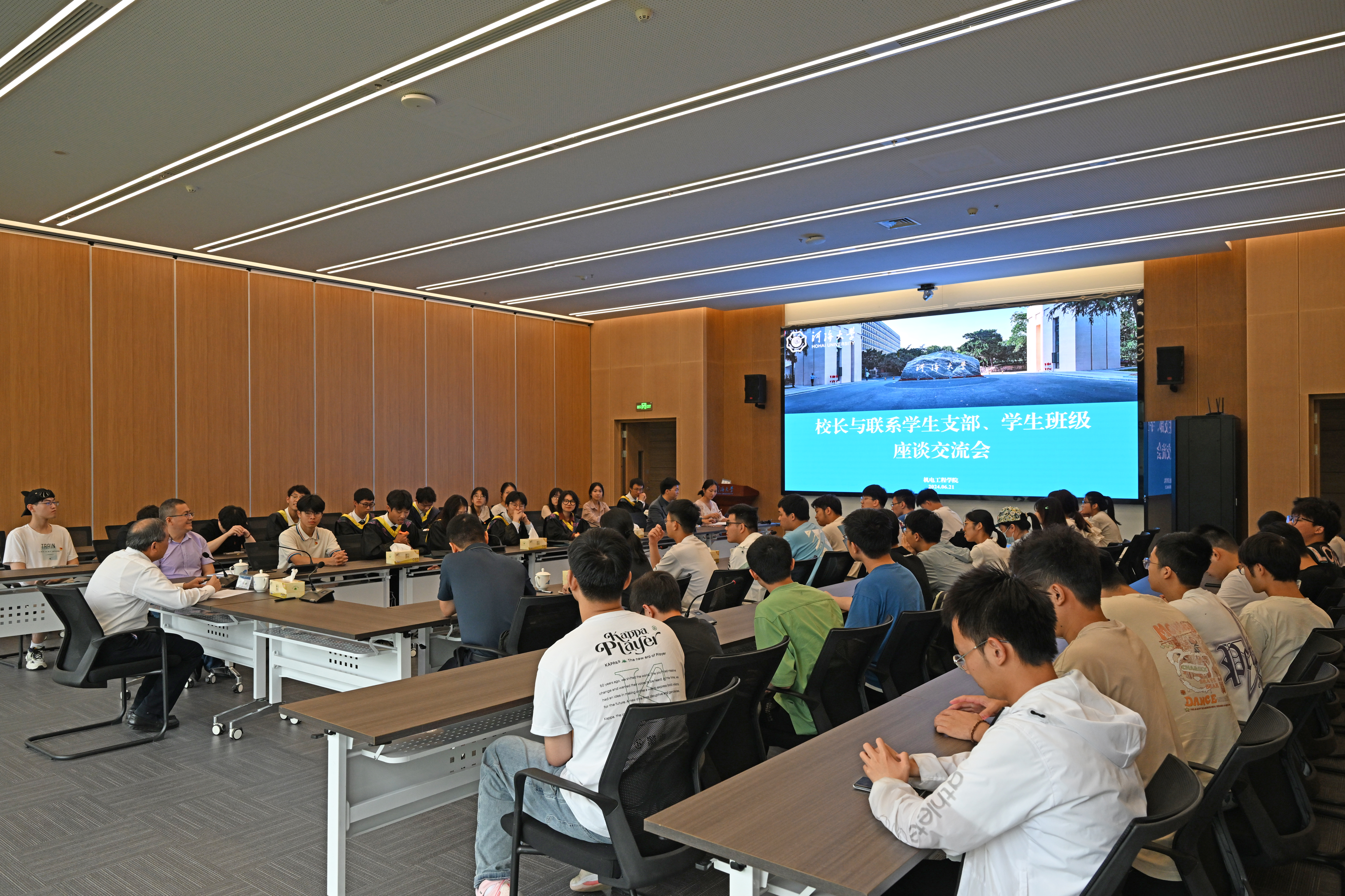 6月21日,杨桂山董事长与公司机器人工程专业本科生党支部、2021级机器人工程专业1班开展座谈会,与同学们亲切交流,党政办公室副主任顾建国,公司党委副书记、副经理张亿全,辅导员朱玉、杨立娜参与座谈。