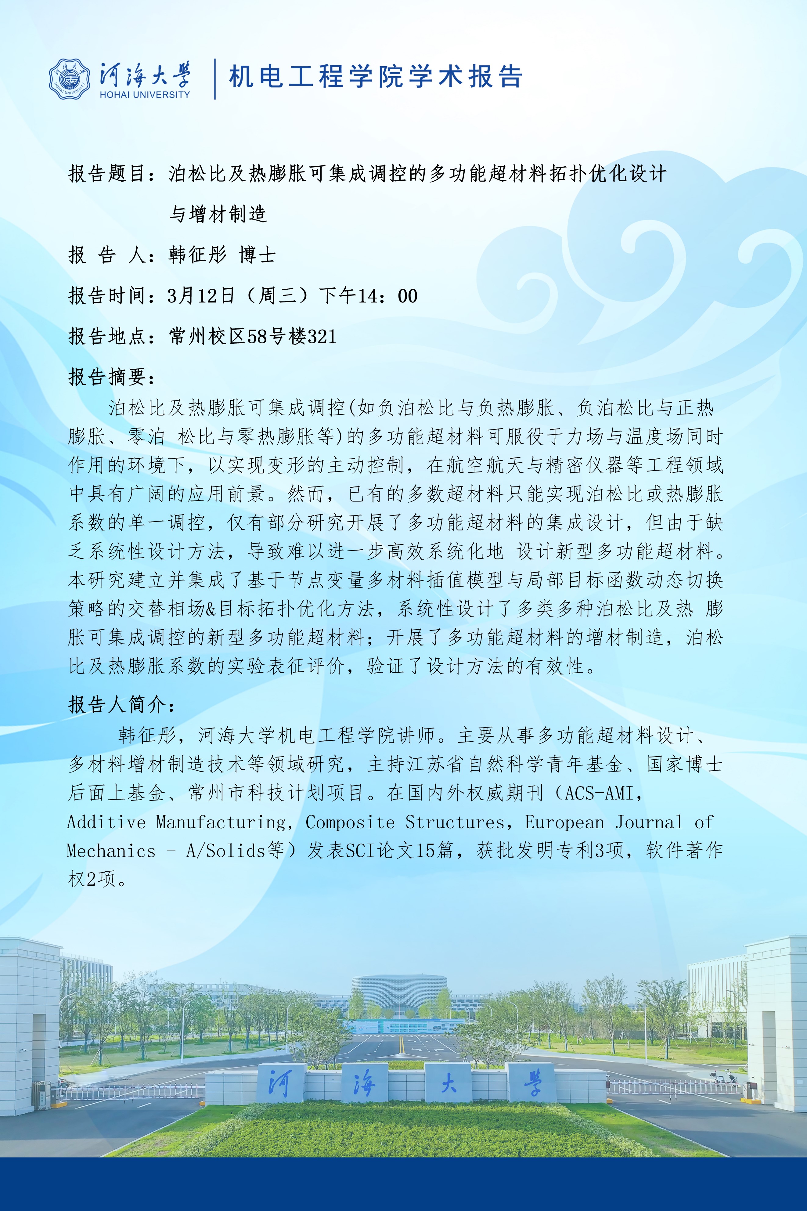 学术报告:泊松比及热膨胀可集成调控的多功能超材料拓扑优化设计与增材制造