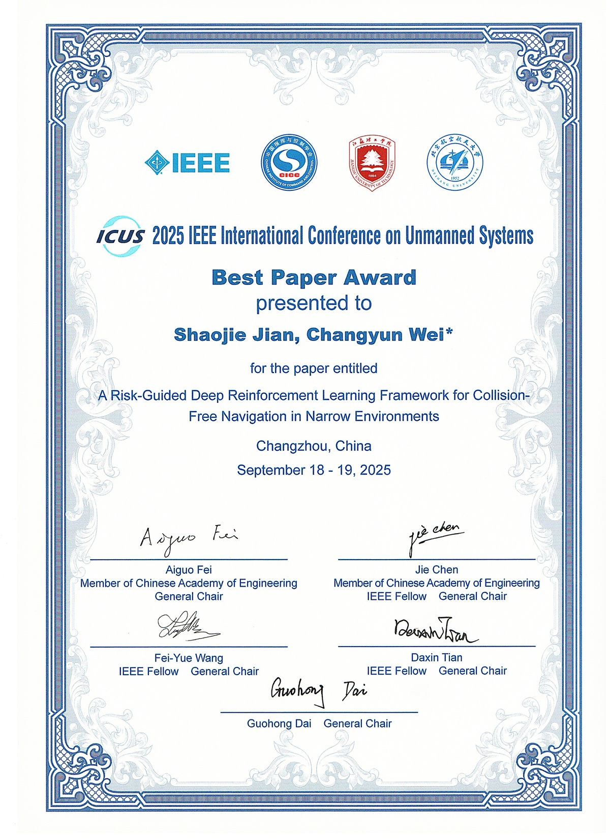 2025年9月18-19日,由中国指挥与控制学会、IEEE 南京分会主办,中国指挥与控制学会无人系统专业委员会承办的 2025 第八届 IEEE 国际无人系统大会(ICUS 2025)在江苏常州召开。williamhill官网硕士研究生简少杰(导师:魏长赟教授)以第一作者身份发表的论文,荣获大会最佳论文奖,论文题目为《A Risk-Guided Deep Reinforcement Learning Framework for Collision-Free Navigation in Narrow Environments》。